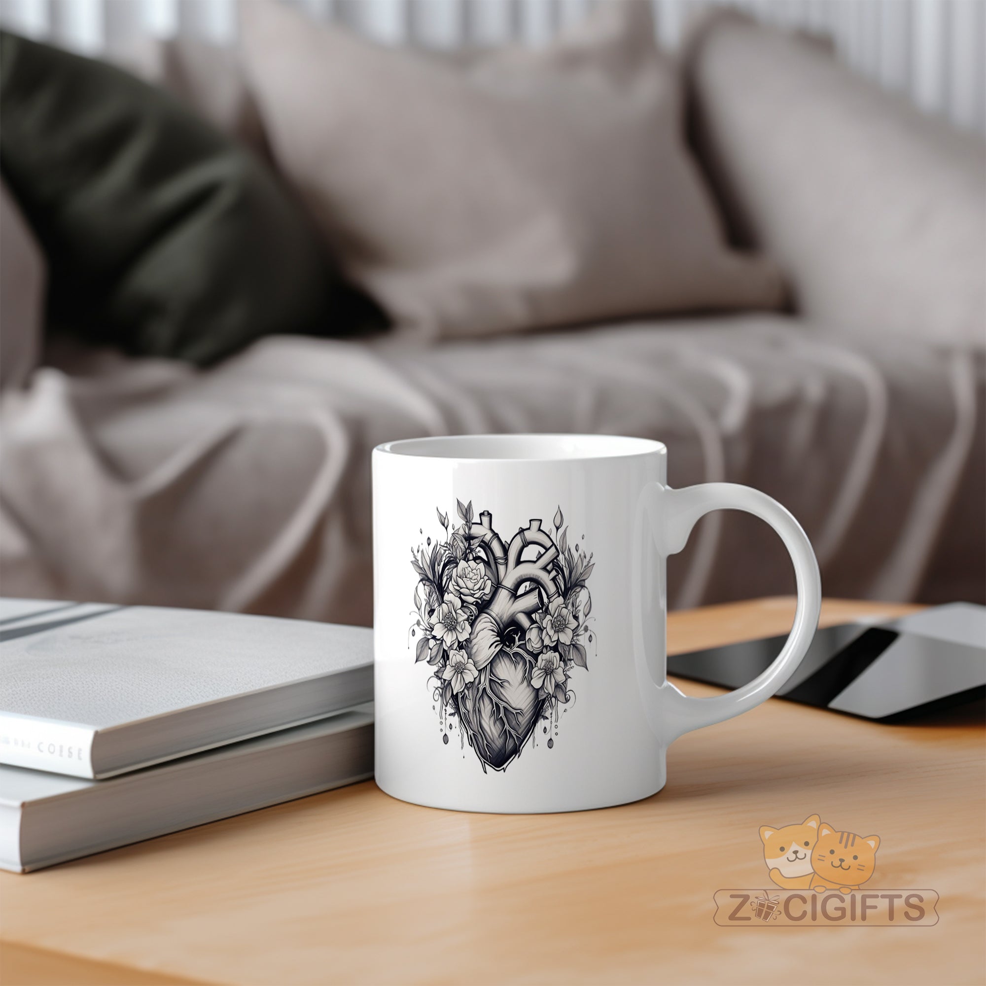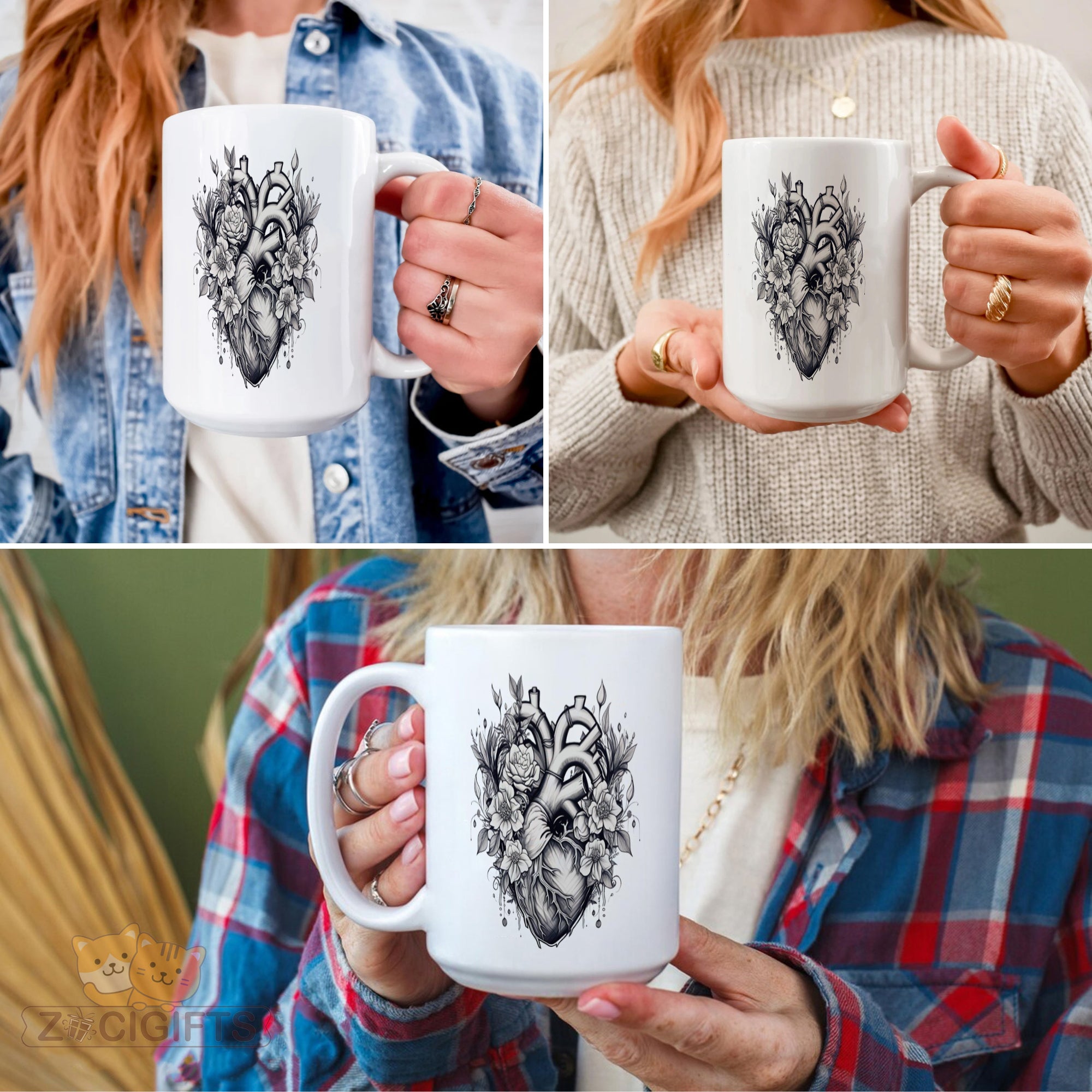 If you’re drawn to gothic aesthetics, anatomical art, or tattoo-inspired designs — this mug is your perfect match. Featuring a striking black-and-white illustration of an anatomical heart intertwined with delicate flowers (roses, blooms, and foliage), it blends dark artistry with botanical beauty.