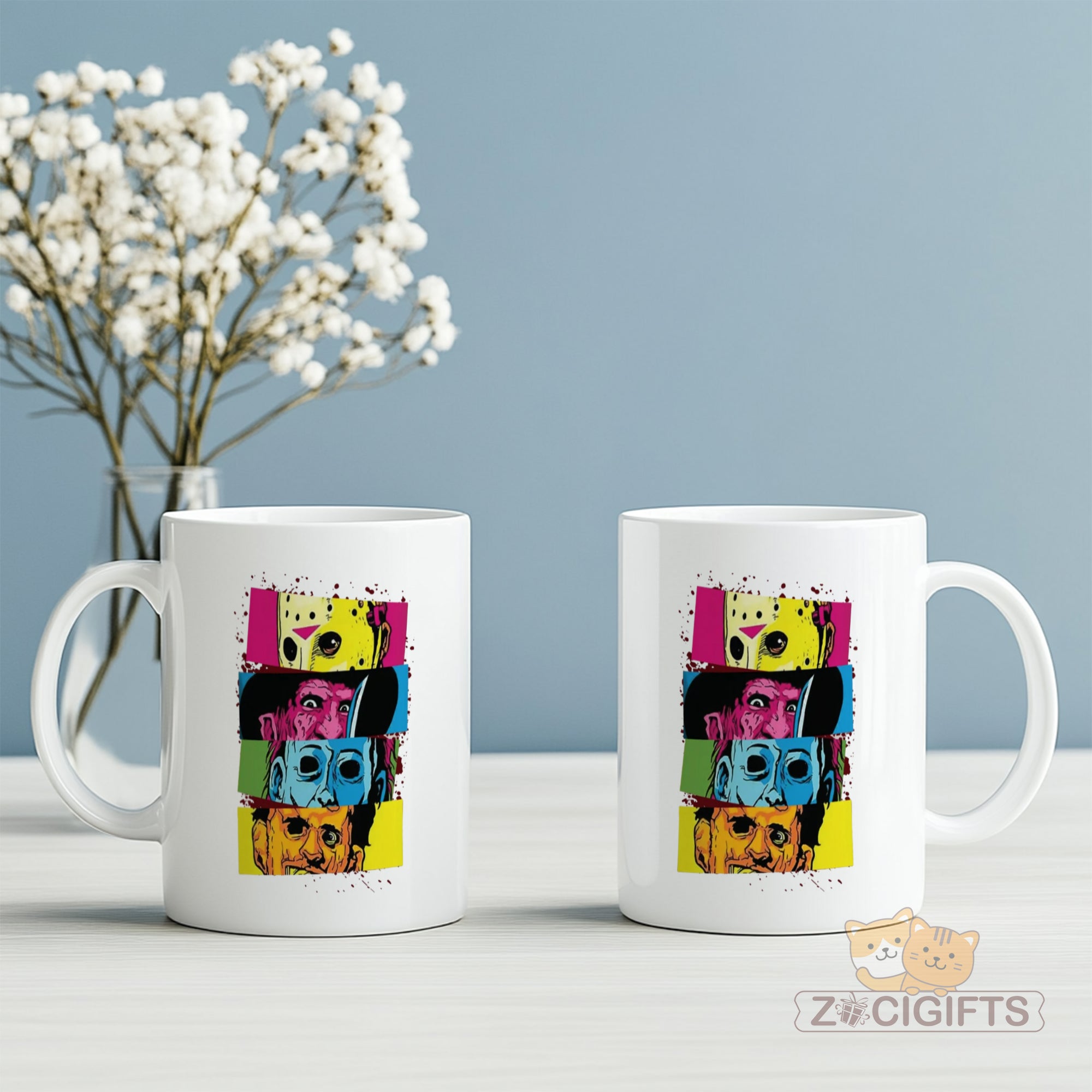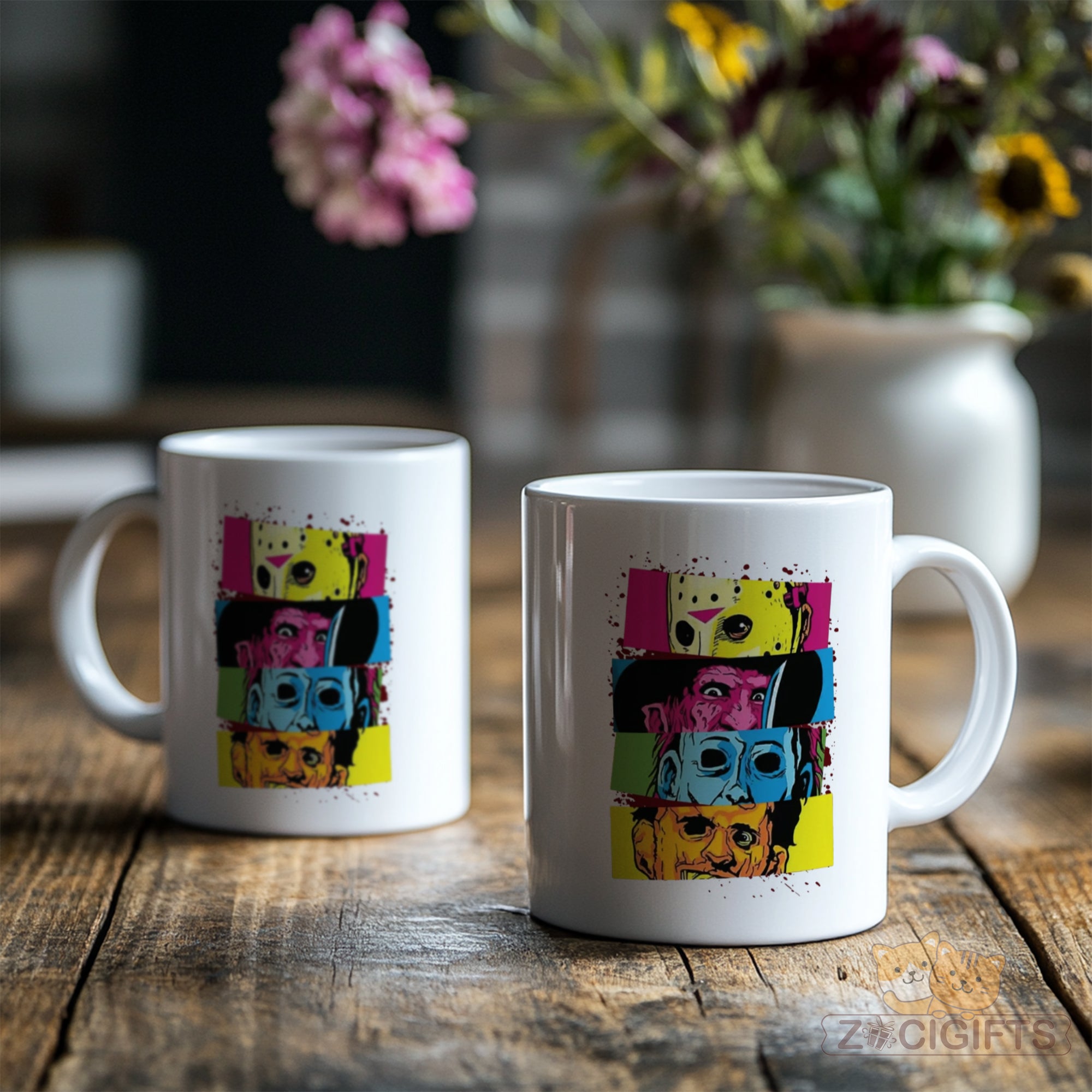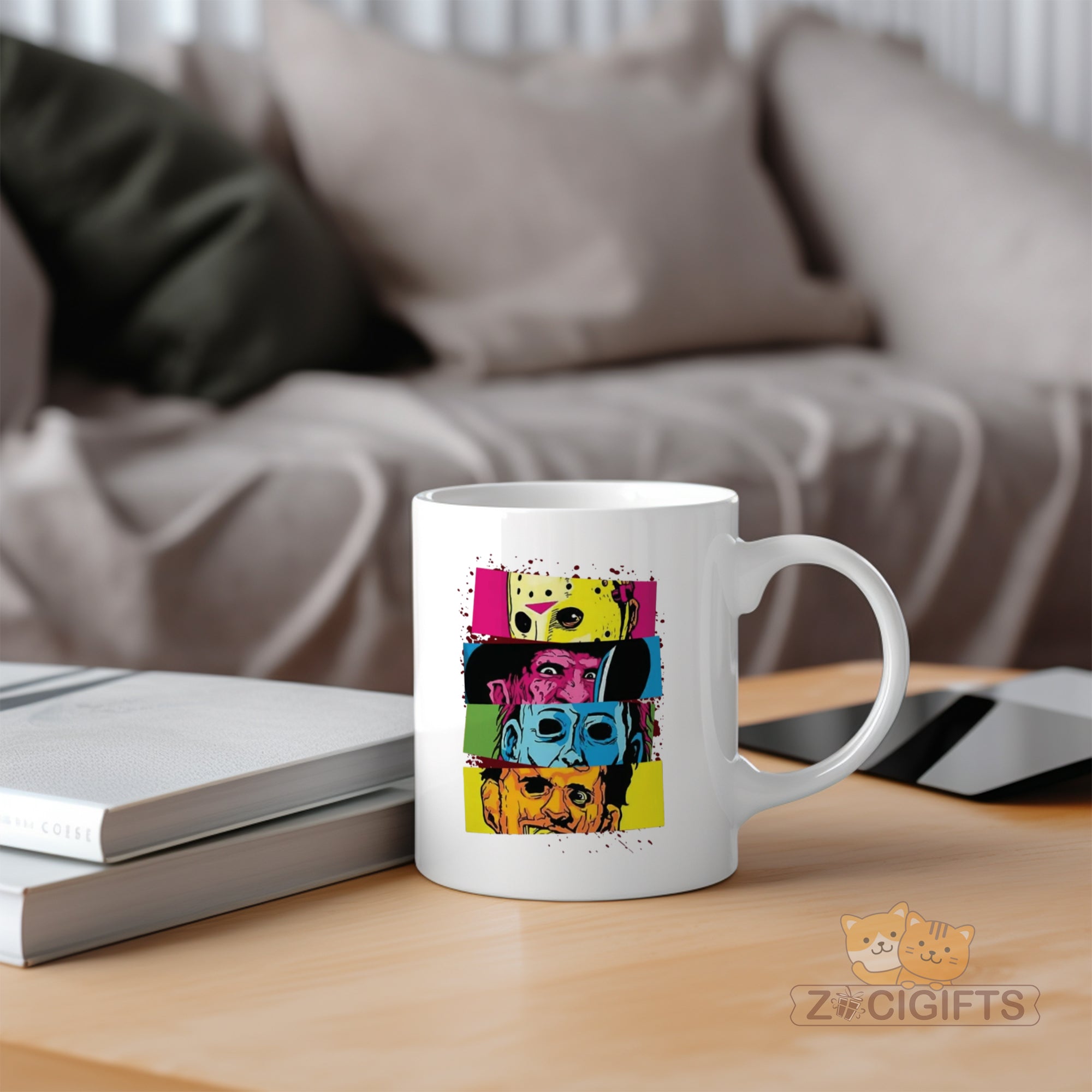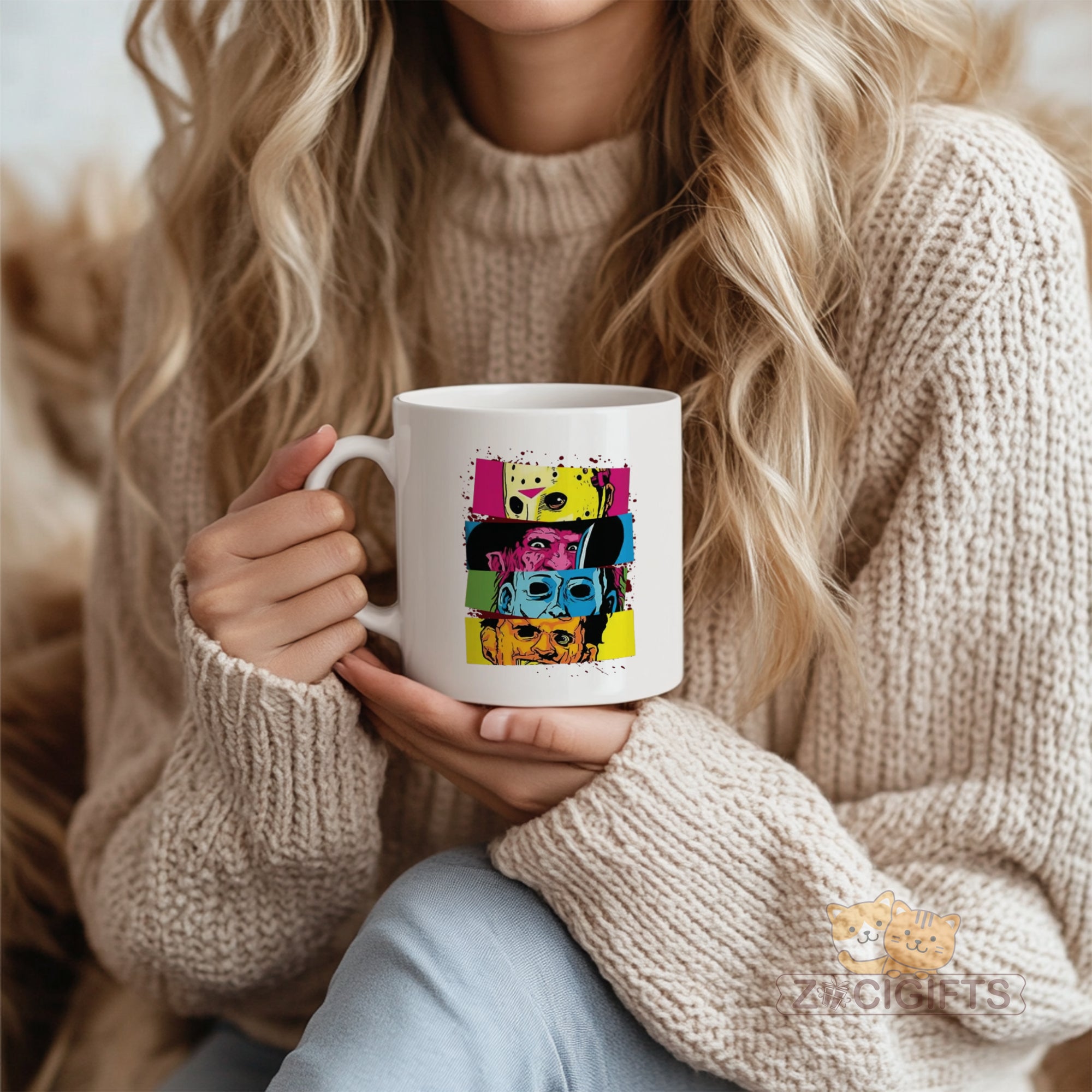 Feast your eyes on this one - of - a - kind ceramic coffee cup that pays homage to some of the most iconic horror movie villains. Each face is rendered in vibrant pop - art style against a contrasting background, making it a true statement piece for your collection.