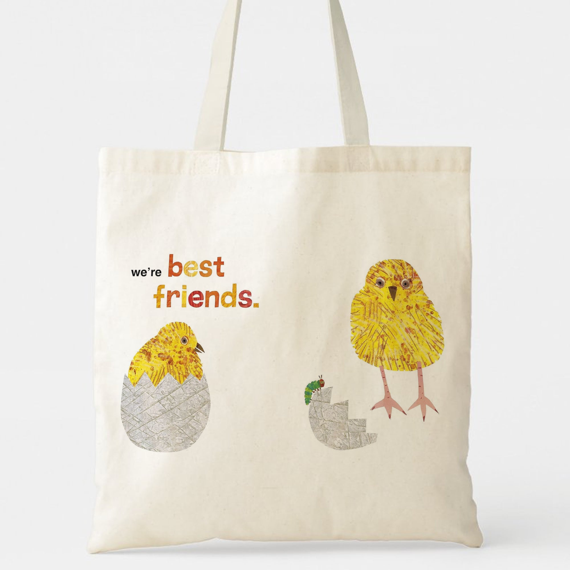 Celebrate a friendship that’s always growing with this utterly charming tote bag! Featuring the sweet declaration “we’re best friends.” alongside two adorable chicks—one just hatching and one standing tall—and a friendly green caterpillar, this design captures the journey of friendship: from its beginning, through growth, and into lifelong companionship.