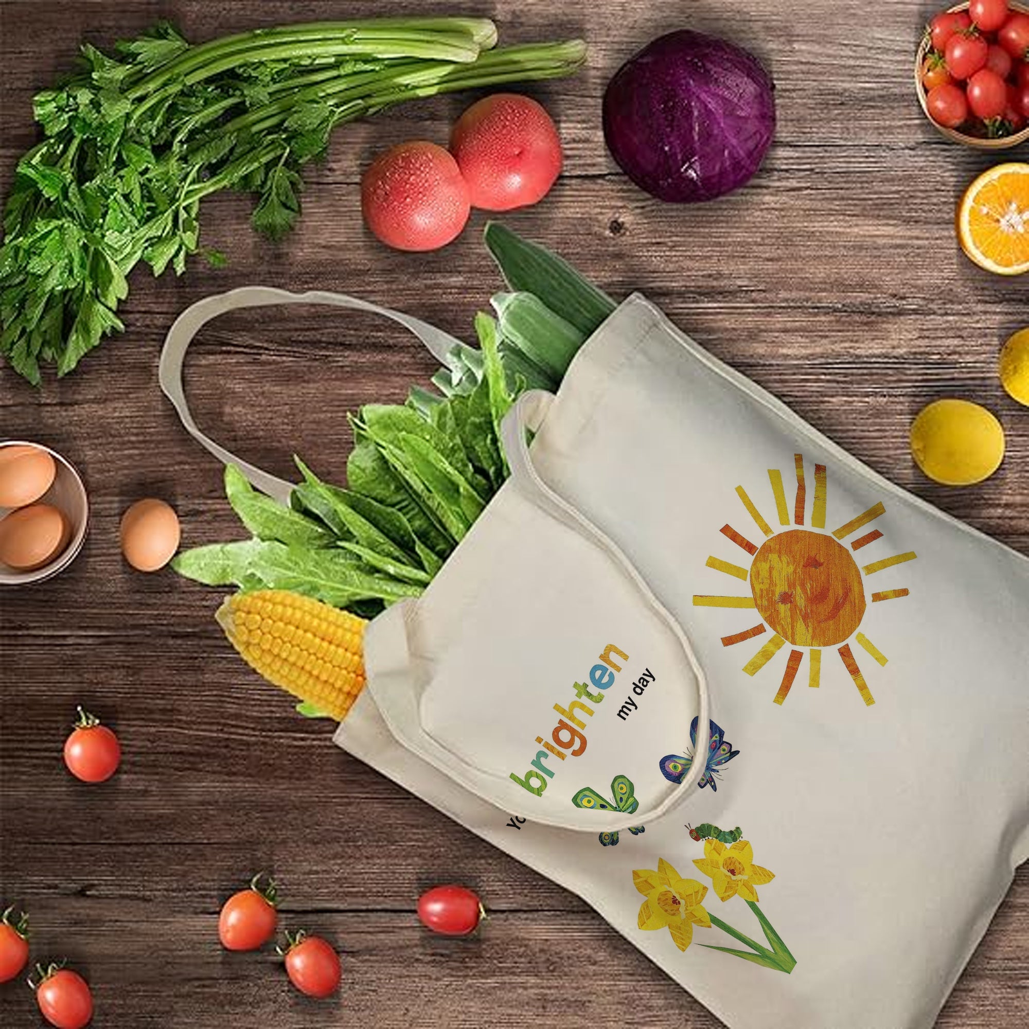 Carry a message of sunshine and gratitude with this joyful tote bag! Featuring the uplifting phrase "You brighten my day" alongside cheerful yellow daffodils, playful butterflies, a friendly caterpillar, and a beaming sun, this design is a daily dose of happiness and appreciation.