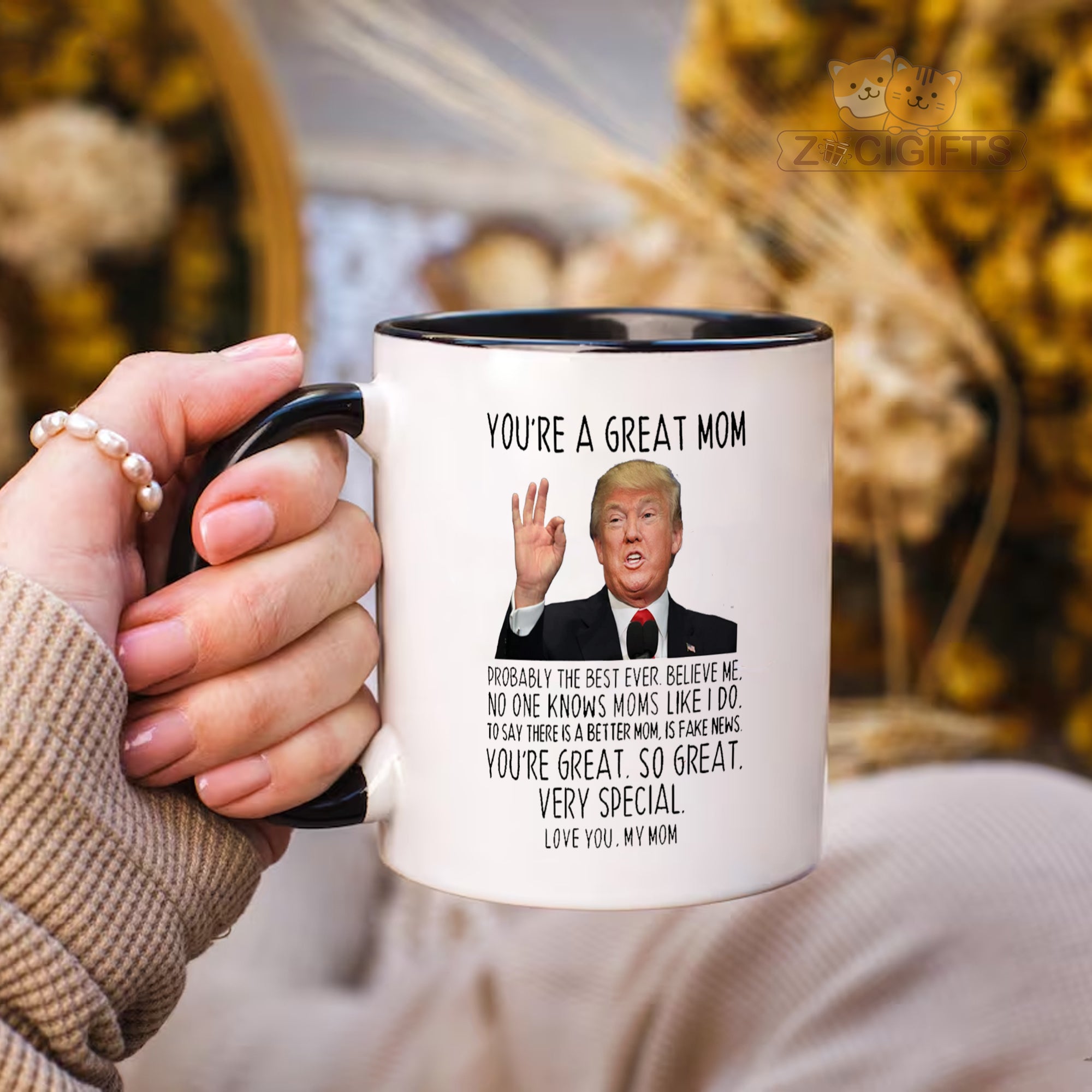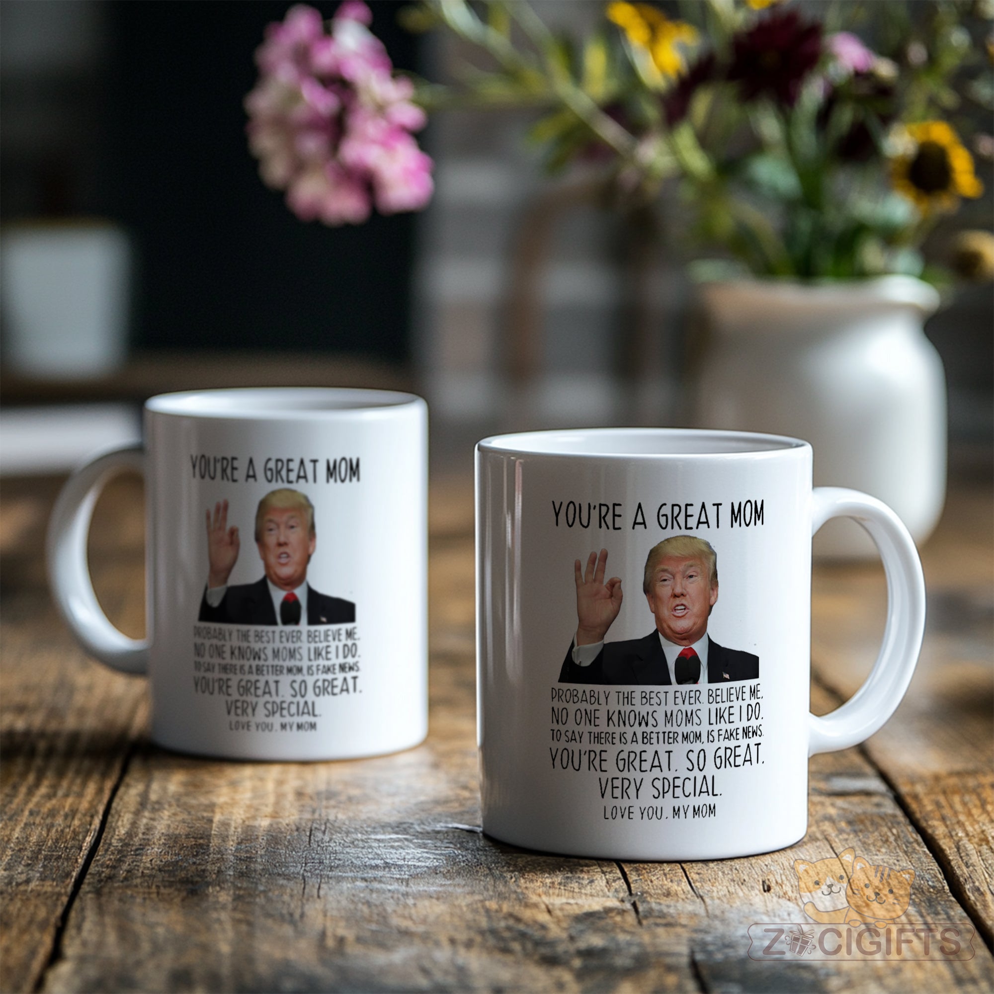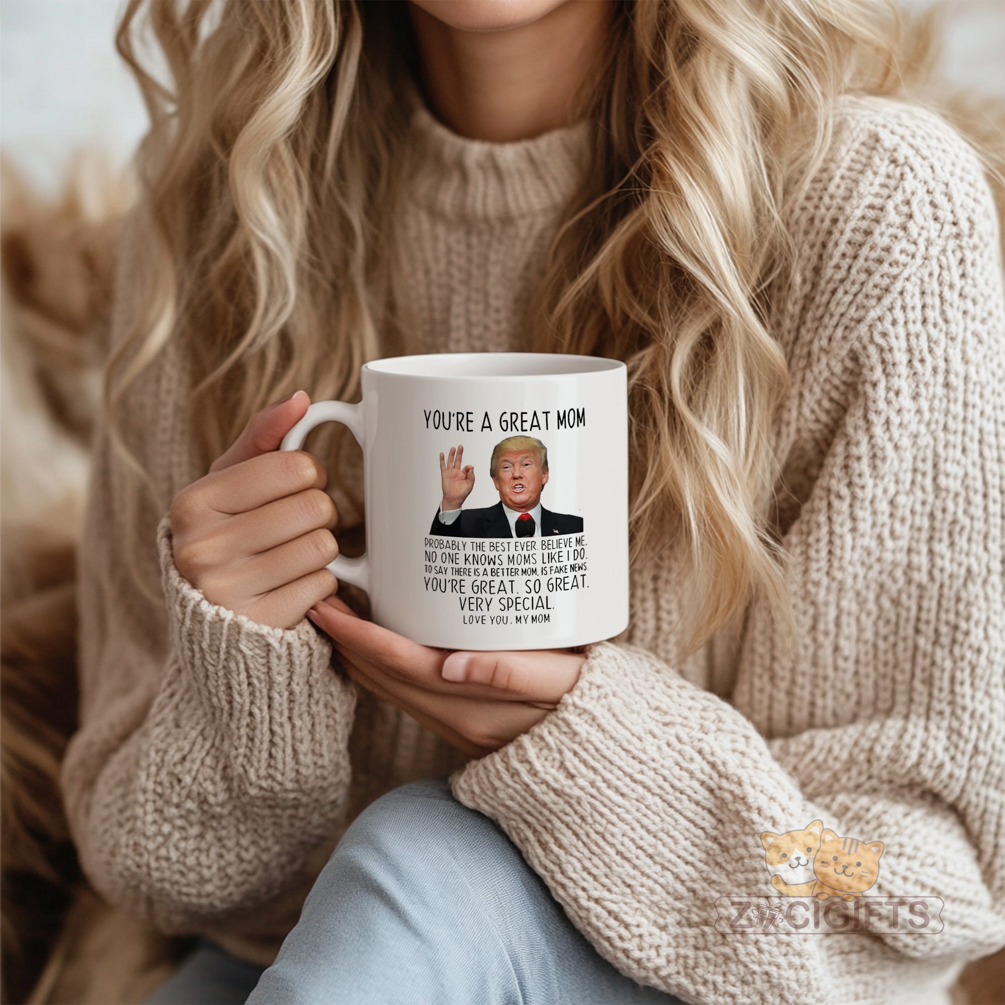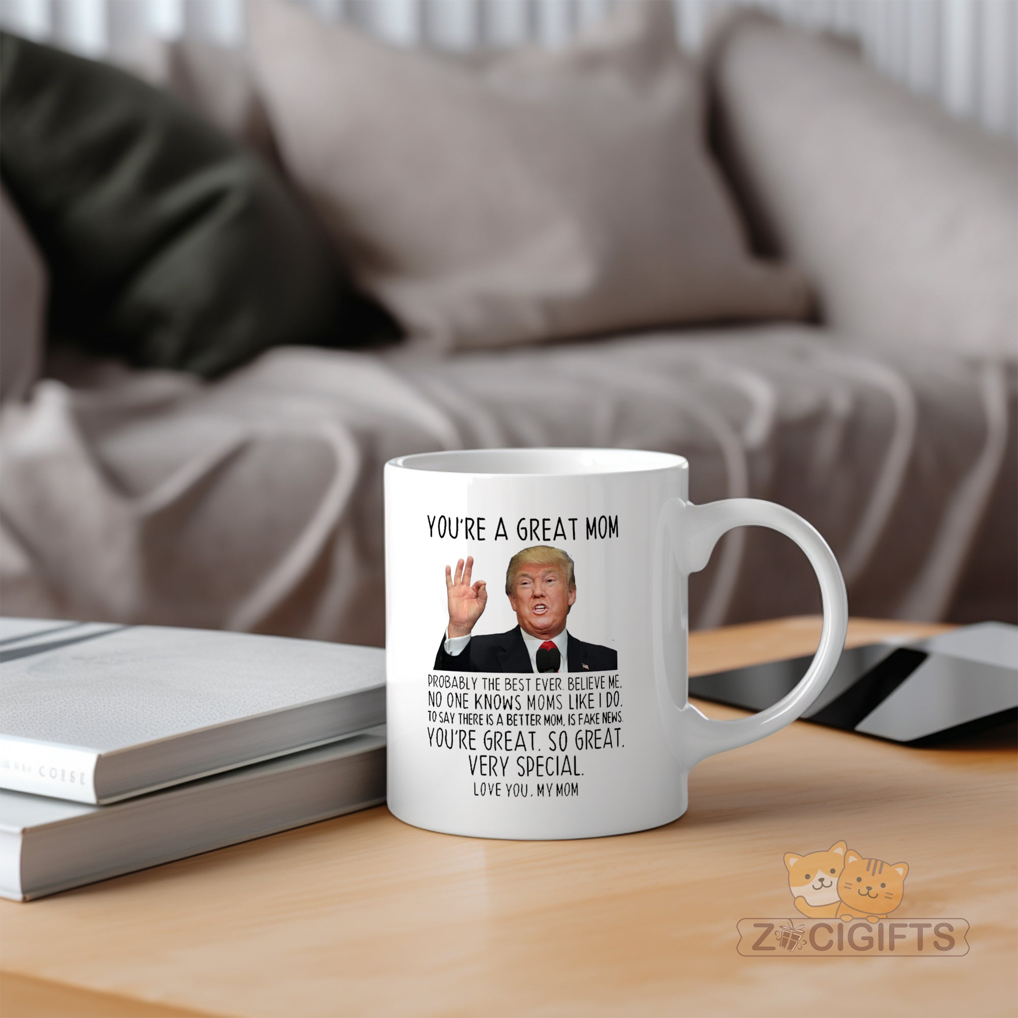 Introducing our exclusive commemorative mug, a perfect blend of humor and sentimentality! This high - quality ceramic mug features an eye - catching design with a quote from Donald Trump that reads, "YOU'RE A GREAT MOM. PROBABLY THE BEST EVER. BELIEVE ME. NO ONE KNOWS MOMS LIKE I DO. TO SAY THERE IS A BETTER MOM, IS FAKE NEWS. YOU'RE GREAT. SO GREAT. VERY SPECIAL. LOVE YOU, MY MOM".