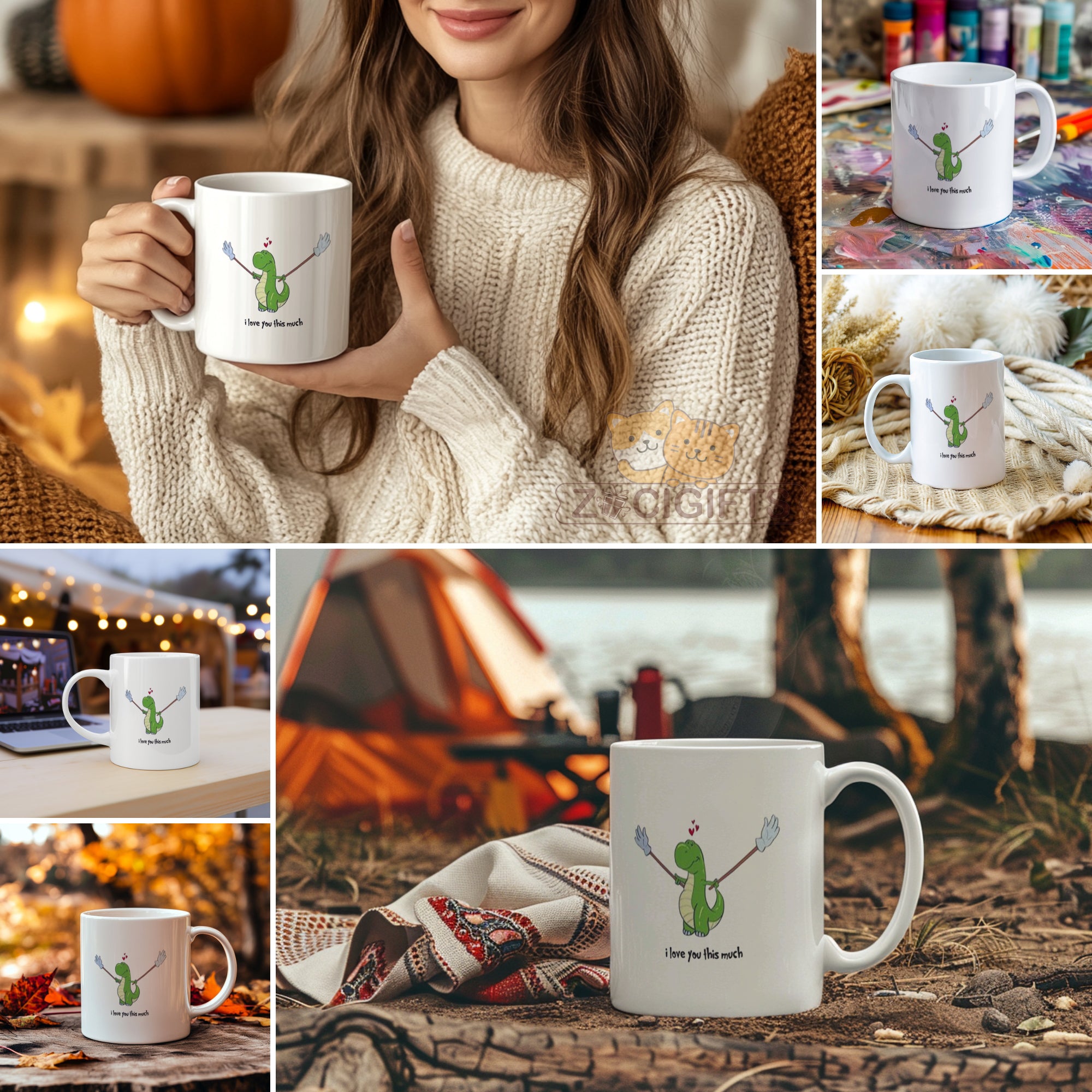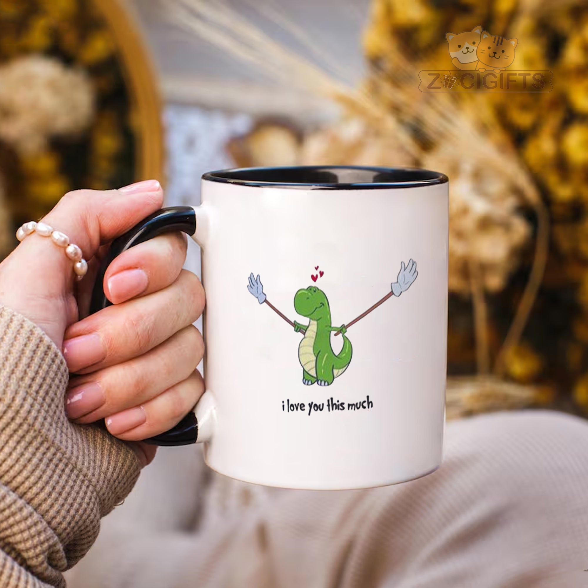 This charming ceramic mug features an adorable green dinosaur holding up a "how much I love you" pole, topped with two red hearts and the sweet phrase "I love you this much". It’s more than a mug—it’s a heartfelt, playful, and universally understandable way to show someone they’re cherished.