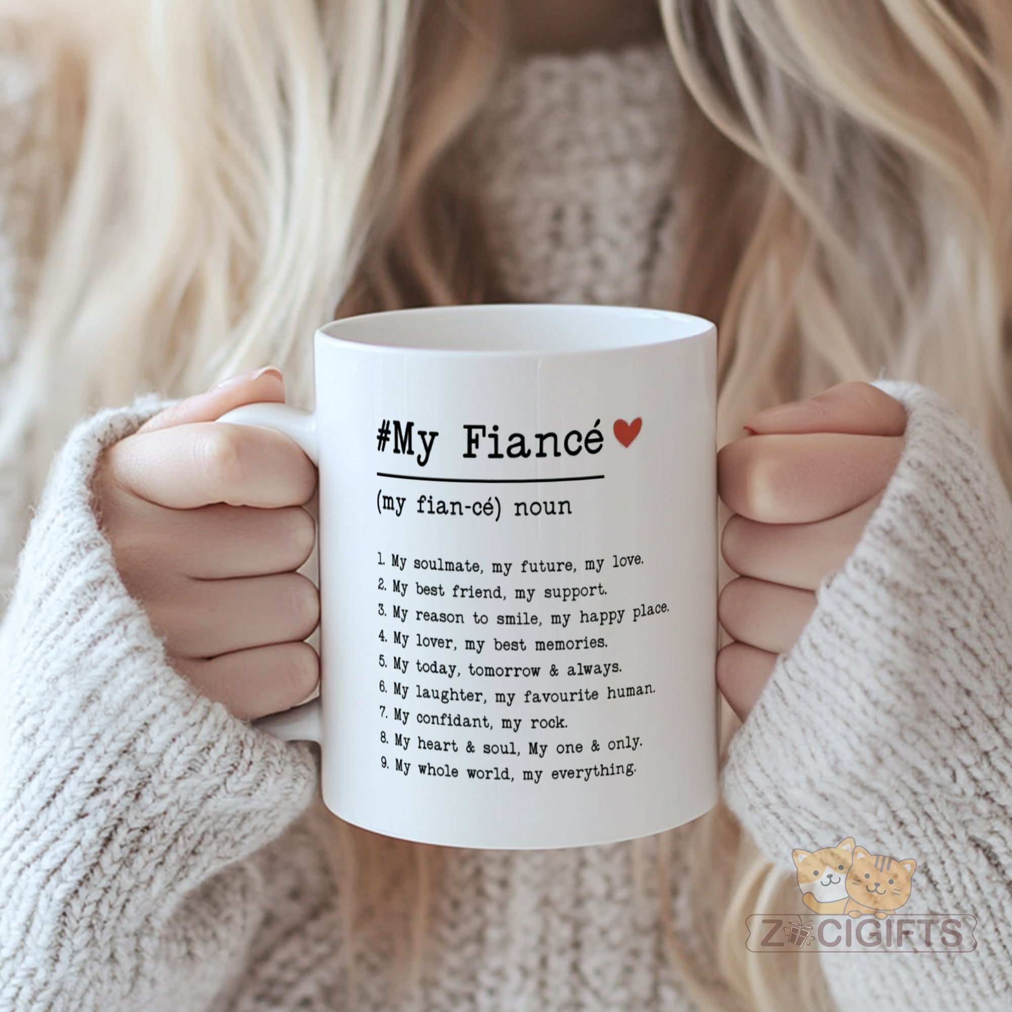 Introducing the perfect tribute to your future husband or wife - the "#My Fiancé" Definition Mug. This beautifully designed white mug features 9 heartfelt definitions that capture exactly what your fiancé(e) means to you, from "My soulmate, my future, my love" to "My whole world, my everything."