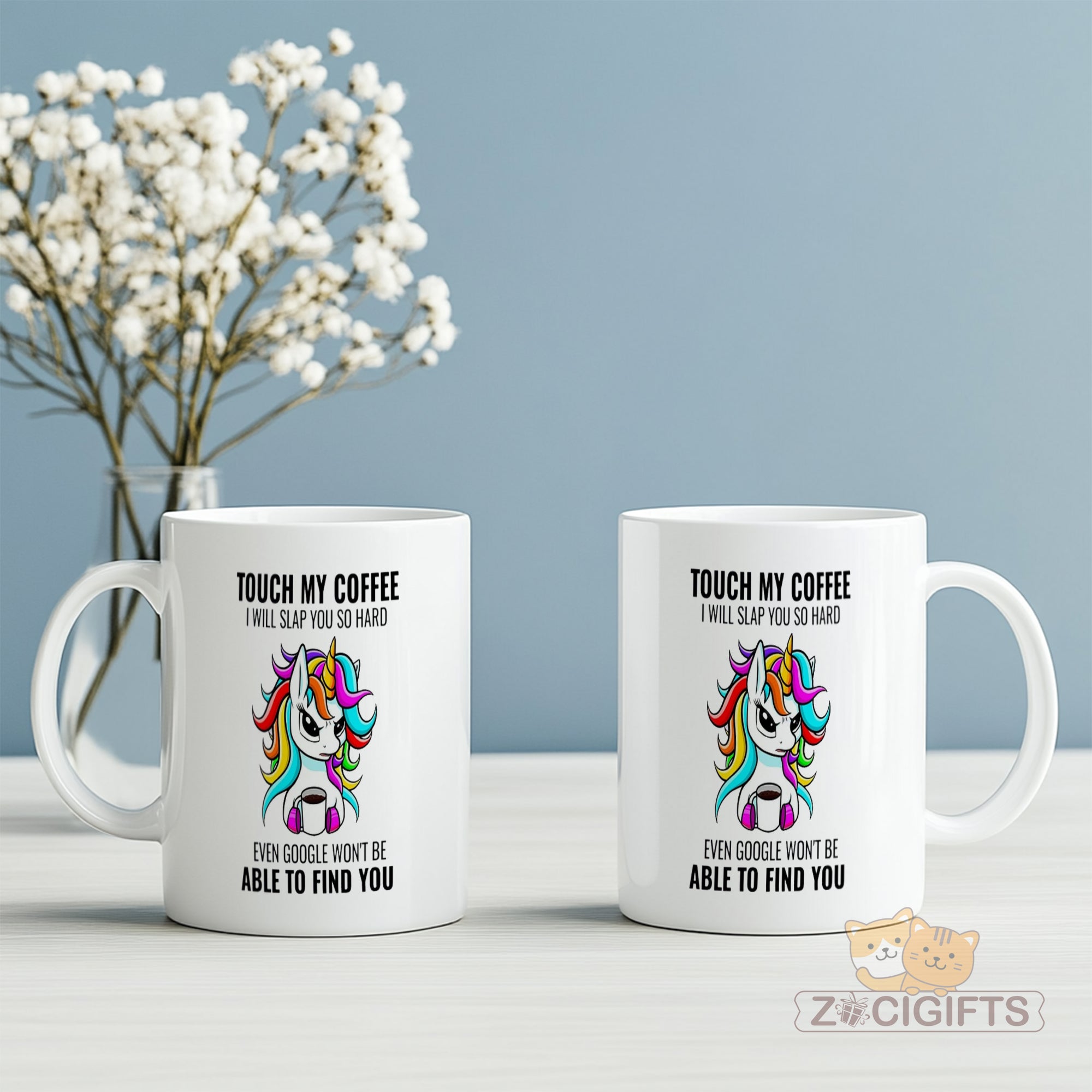 Feast your eyes on the bold design: a colorful unicorn clutches a coffee cup, with the defiant text "TOUCH MY COFFEE I WILL SLAP YOU SO HARD EVEN GOOGLE WON'T BE ABLE TO FIND YOU" surrounding it. It blends unicorn whimsy with aggressive (yet funny) coffee-loving energy — ideal for your morning brew, afternoon pick-me-up, or anytime you need to defend your coffee.