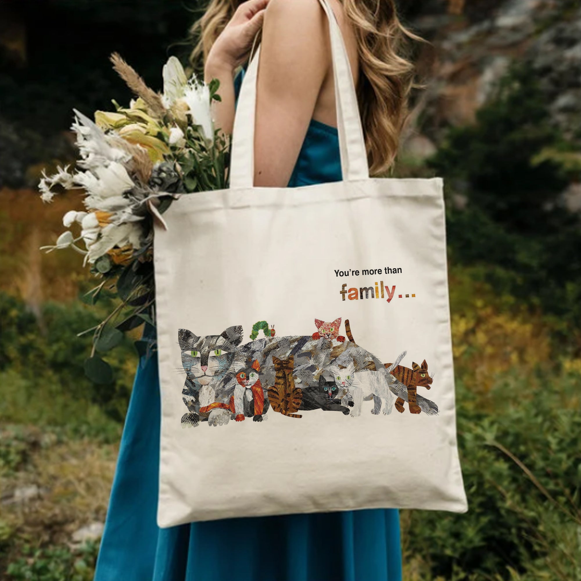 Express the profound bond that goes beyond words with our “You‘re more than family…” Tote Bag. Adorned with a delightful parade of colorful, unique cats, this bag captures the essence of those irreplaceable relationships that feel like home, yet are chosen. It’s the perfect way to tell your favorite person just how much they mean to you.
