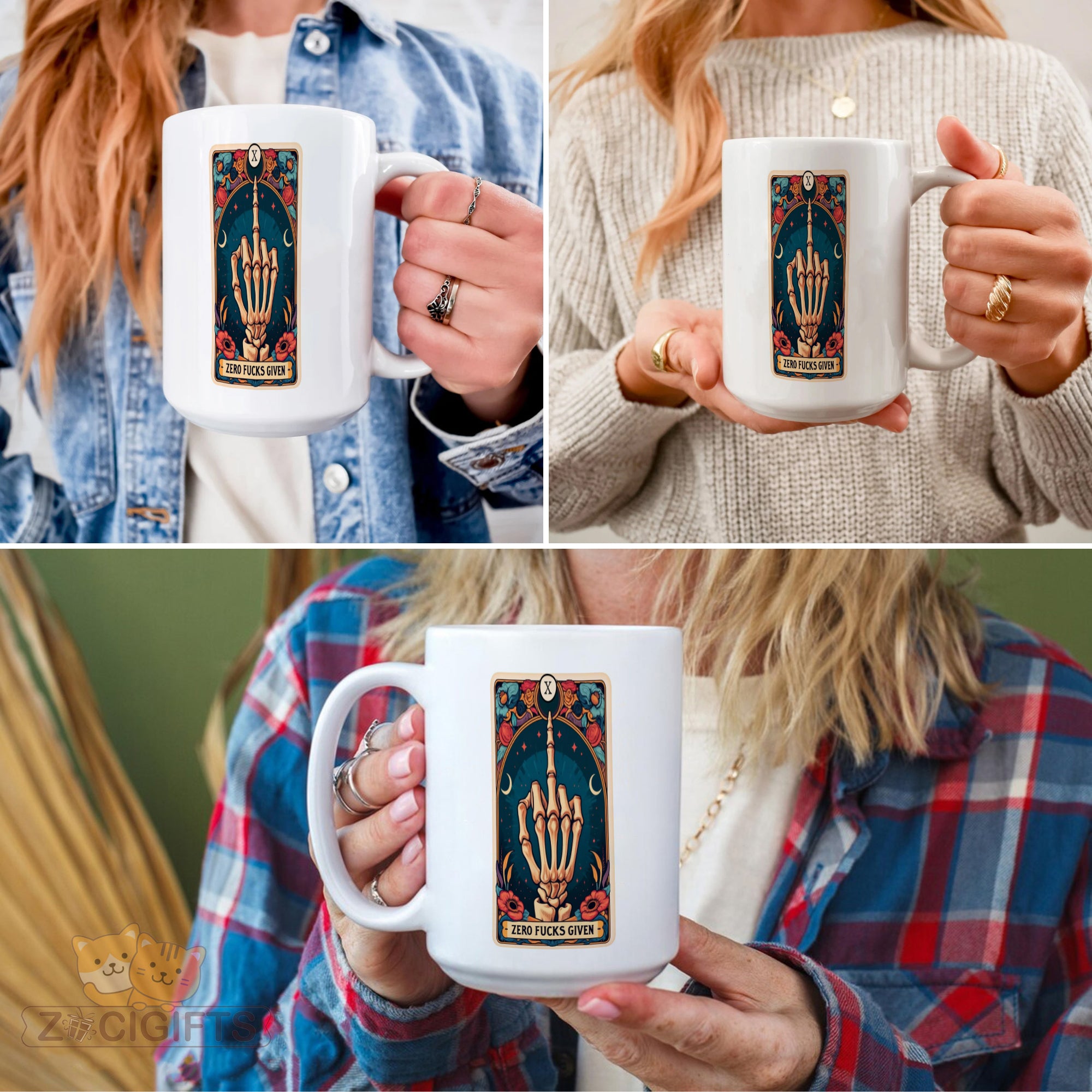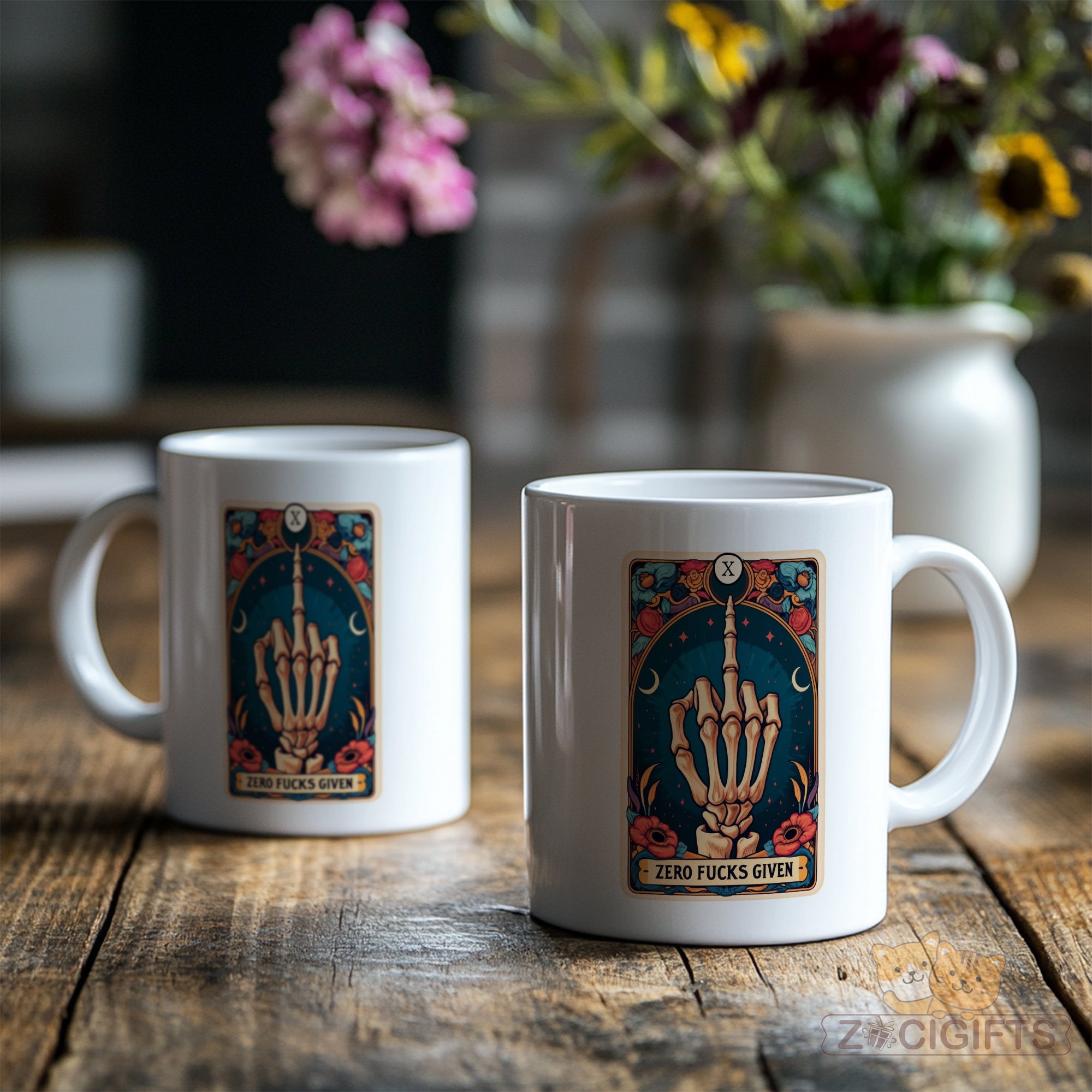 If you live by “zero fucks given” energy and love gothic, tarot-inspired vibes — this mug is your bold spirit animal. Featuring a tarot card-style design with a skeleton hand flipping the middle finger, vibrant florals, celestial details, and the blunt text “ZERO FUCKS GIVEN,” it’s the perfect way to joke about not caring… with artistic flair.
