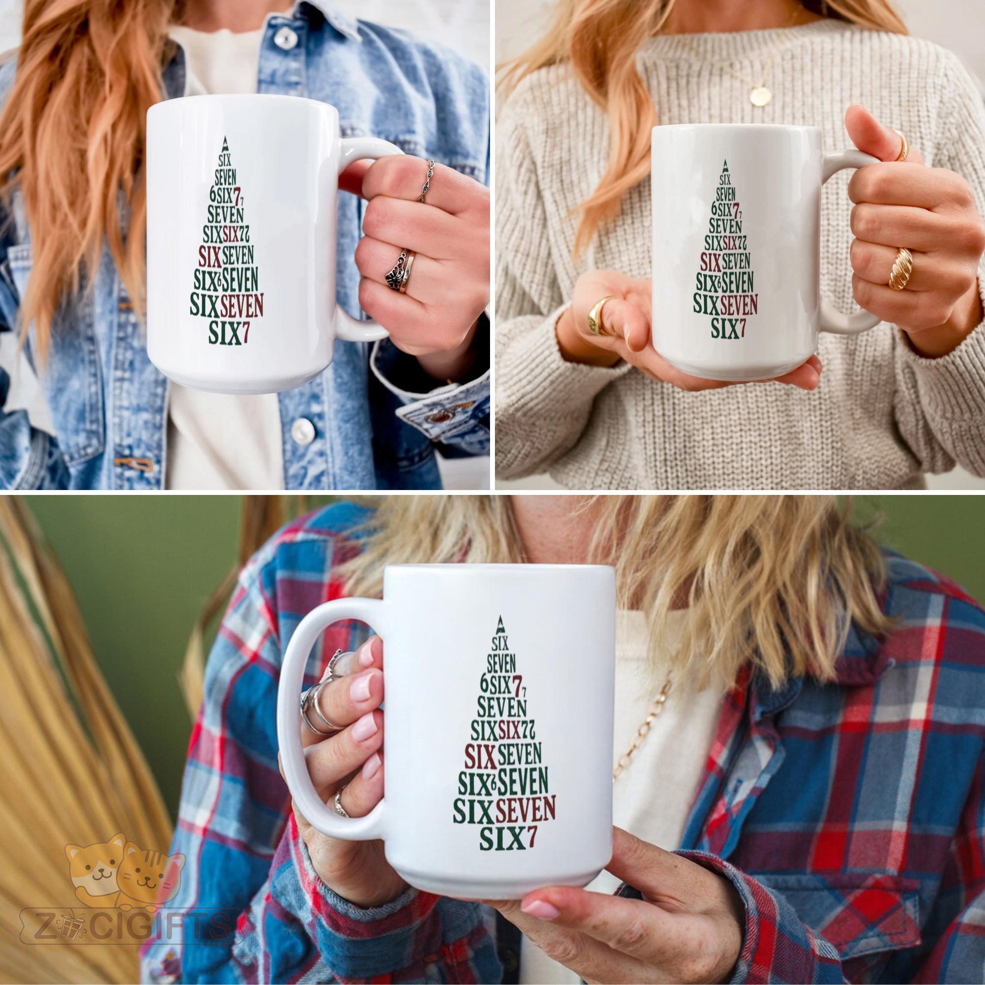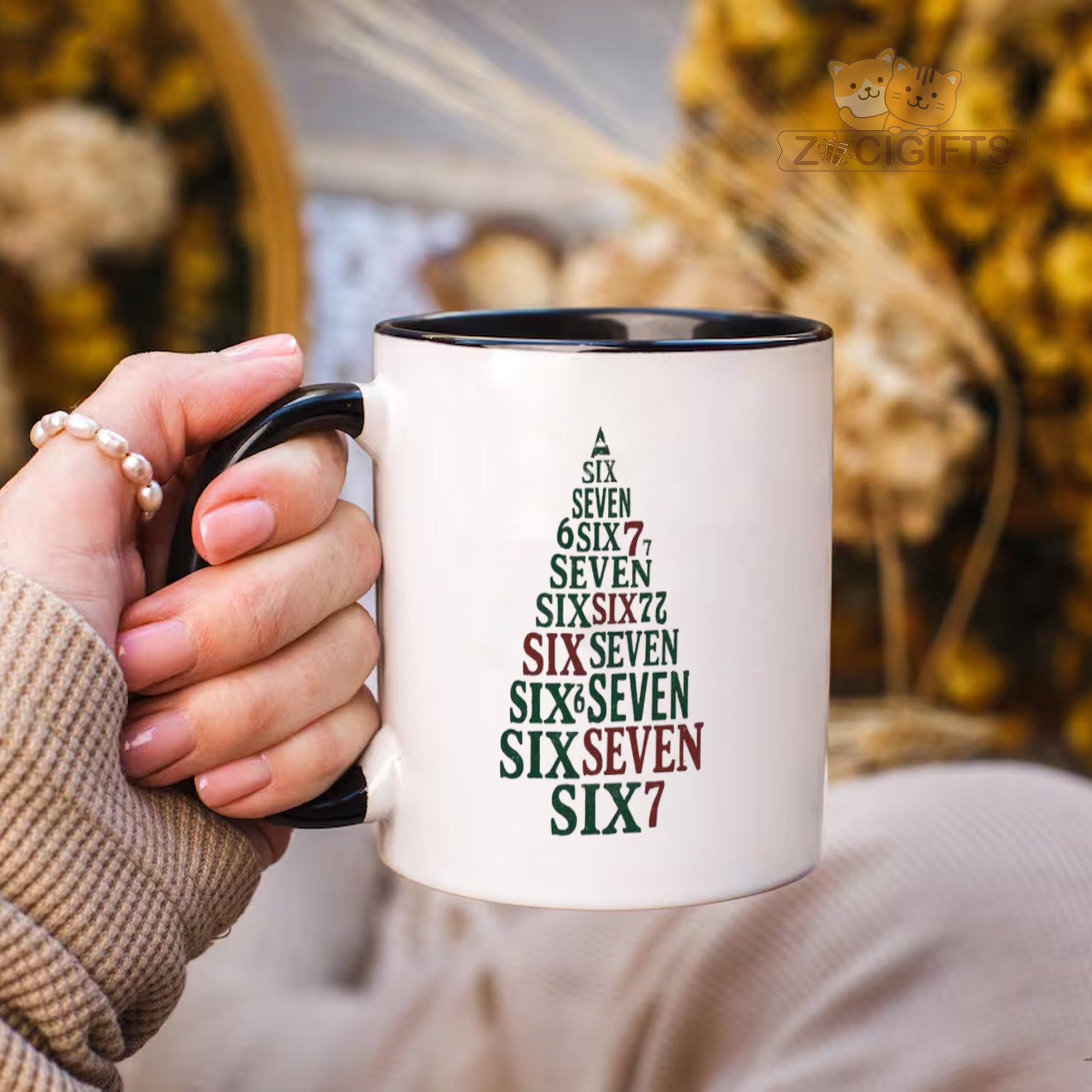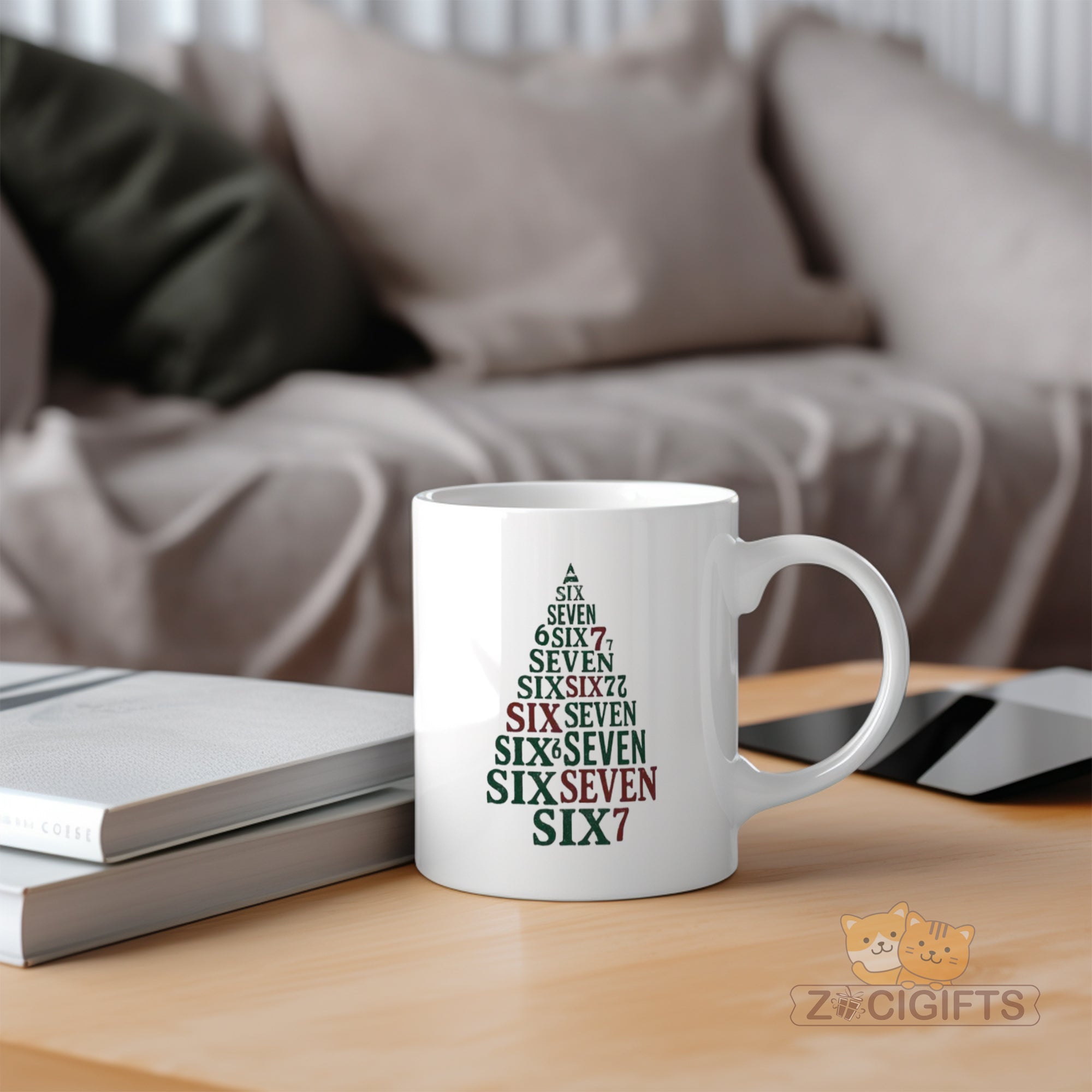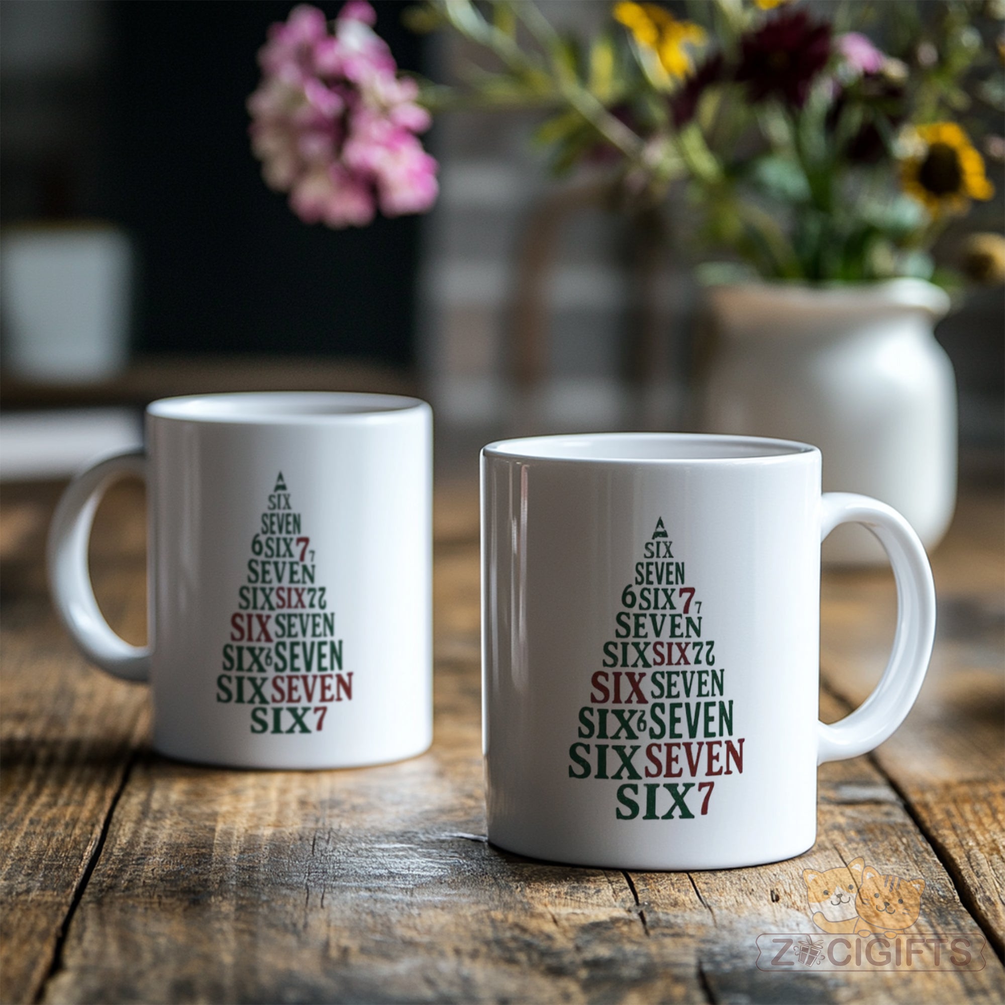Unwrap the most conversation-starting cup of the season! Our "SIX SEVEN" Christmas Tree Typography Mug transforms playful text into a festive icon. As seen in your cozy photos—nestled among warm fairy lights and dry florals—the words “SIX”, “SEVEN”, and their fun variations (like “6SIX7” and “SIX&SEVEN”) are artfully arranged in the unmistakable shape of a Christmas tree, rendered in classic holiday green and red. This is the perfect gift for anyone who loves clever design, modern typography, and a touch of holiday wit.